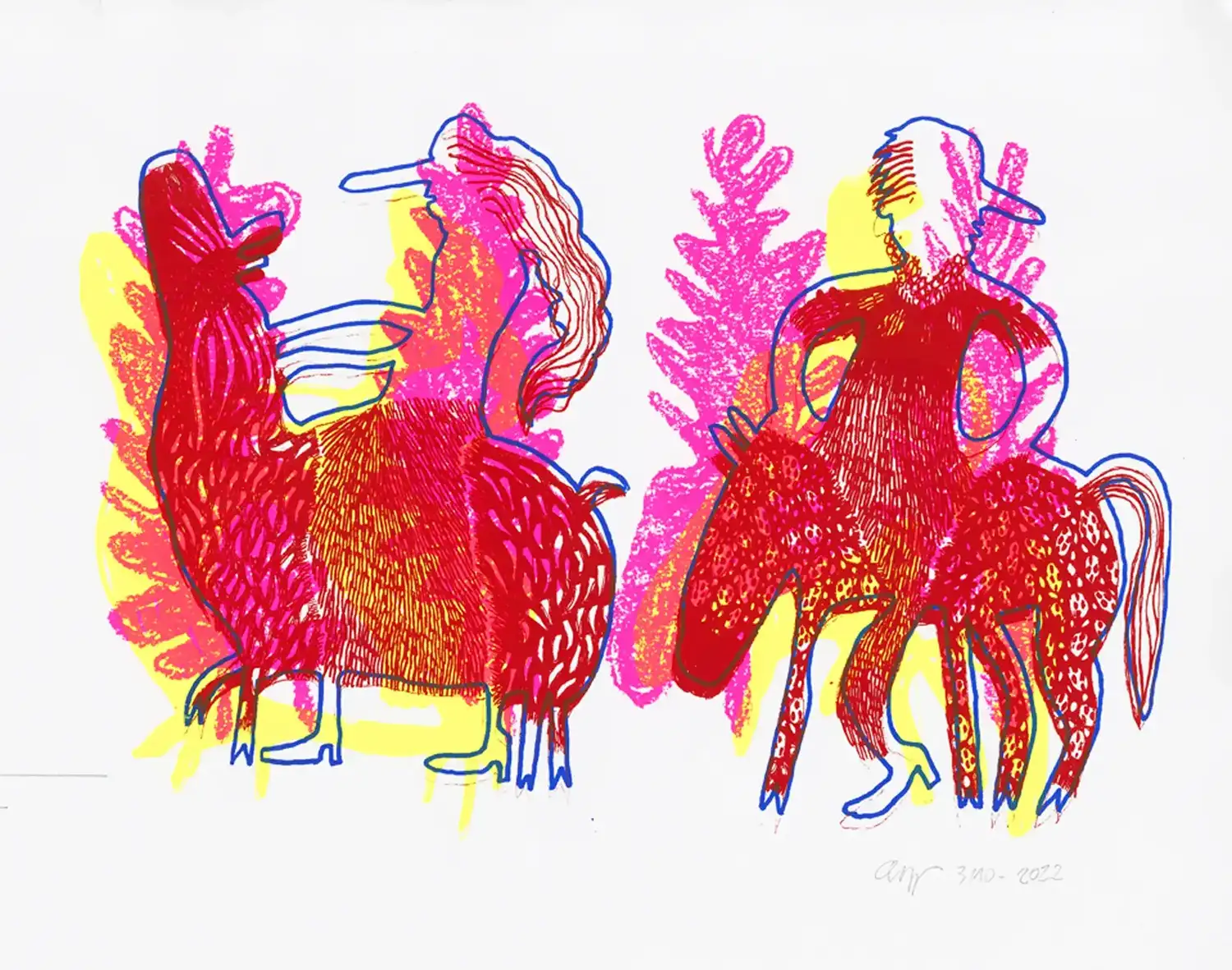 Sérigraphie – 4 passages – rose fluo, jaune fluo, rouge et bleu